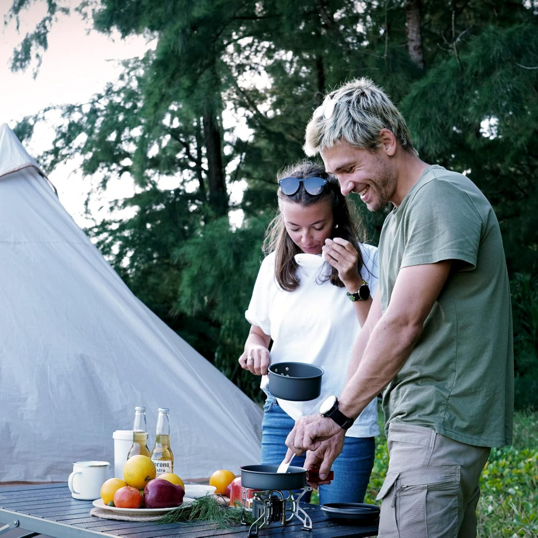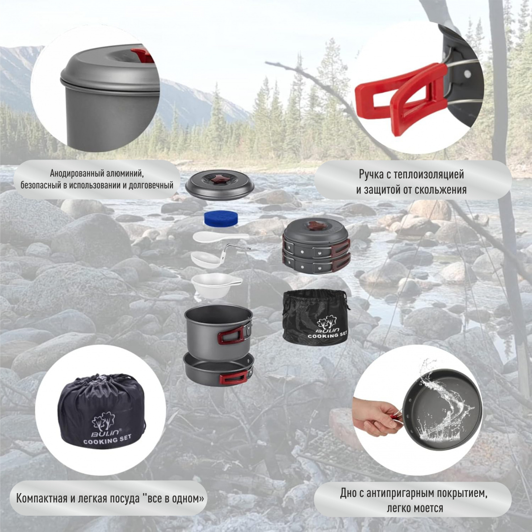 Компактный и легкий набор посуды для одного человека. Кастрюля и сковородка изготовлены из высококачественного алюминия с анодированным покрытием.
