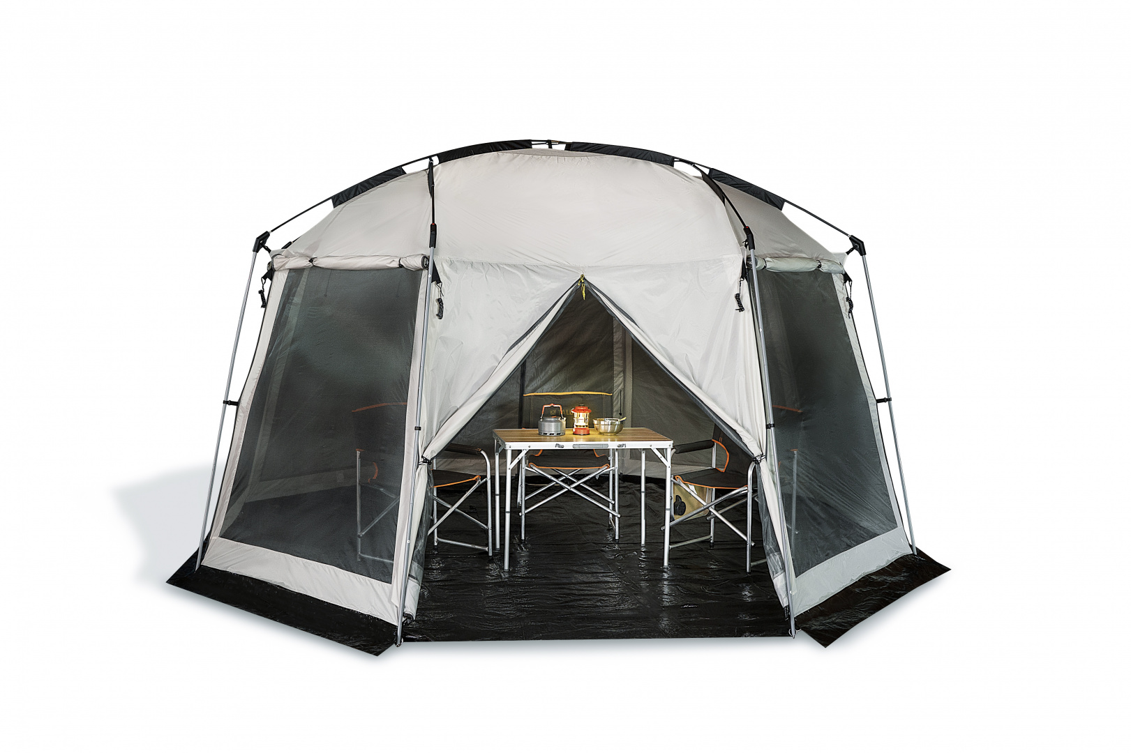 Самый большой кемпинговый шатер с комбинированным каркасом, отличный вариант для всех любителей кемпингового отдыха. Простая и быстрая установка, повышенная ветроустойчивость благодаря 8-ми гранной конструкции.. Шатер имеет идеальное соотношение объем-вес и удобную сумку для переноски. Внешний тент надежно защищает от сильного ветра и атмосферных осадков. Все стенки шатра имеют возможность полного подъема и продублированы москитными сетками, что дает увеличенный обзор, полную вентиляцию и дополнительное освещение.